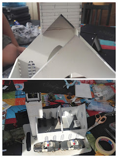 Also after assembly (so if you get a church after this, consider doing it before) I figured there was room in the tower for a small platform. Using a sharp knife, I cut off the triangular piece in the tower. This gave room for a small floor of ice cream sticks.