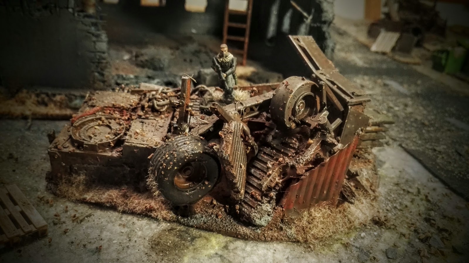 Using different nuances of cheap brown and grey spray. Cover this terrain up. Then with a dry brush you can quickly pick out some details. A box, lid, wheel, plate here and there. Then a all over dry brush layer of metal color. It's supposed to be quick, no need to waste time on a junk pile.